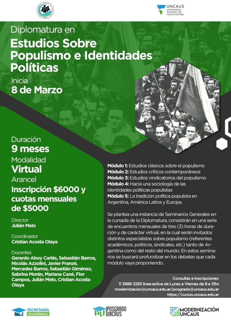 La Diplomatura está destinada a estudiantes, investigadores, referentes sociales y del sector sindical y privado, funcionarios de organismos públicos y/o privados interesados en los debates en torno a las identidades y los discursos populistas clásicos y contemporáneos de Argentina, América Latina y el mundo.